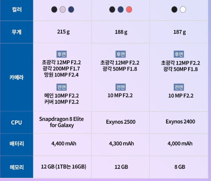 - 성능: 엑시노스 2500, 12GB 램, 1TB 저장소 옵션